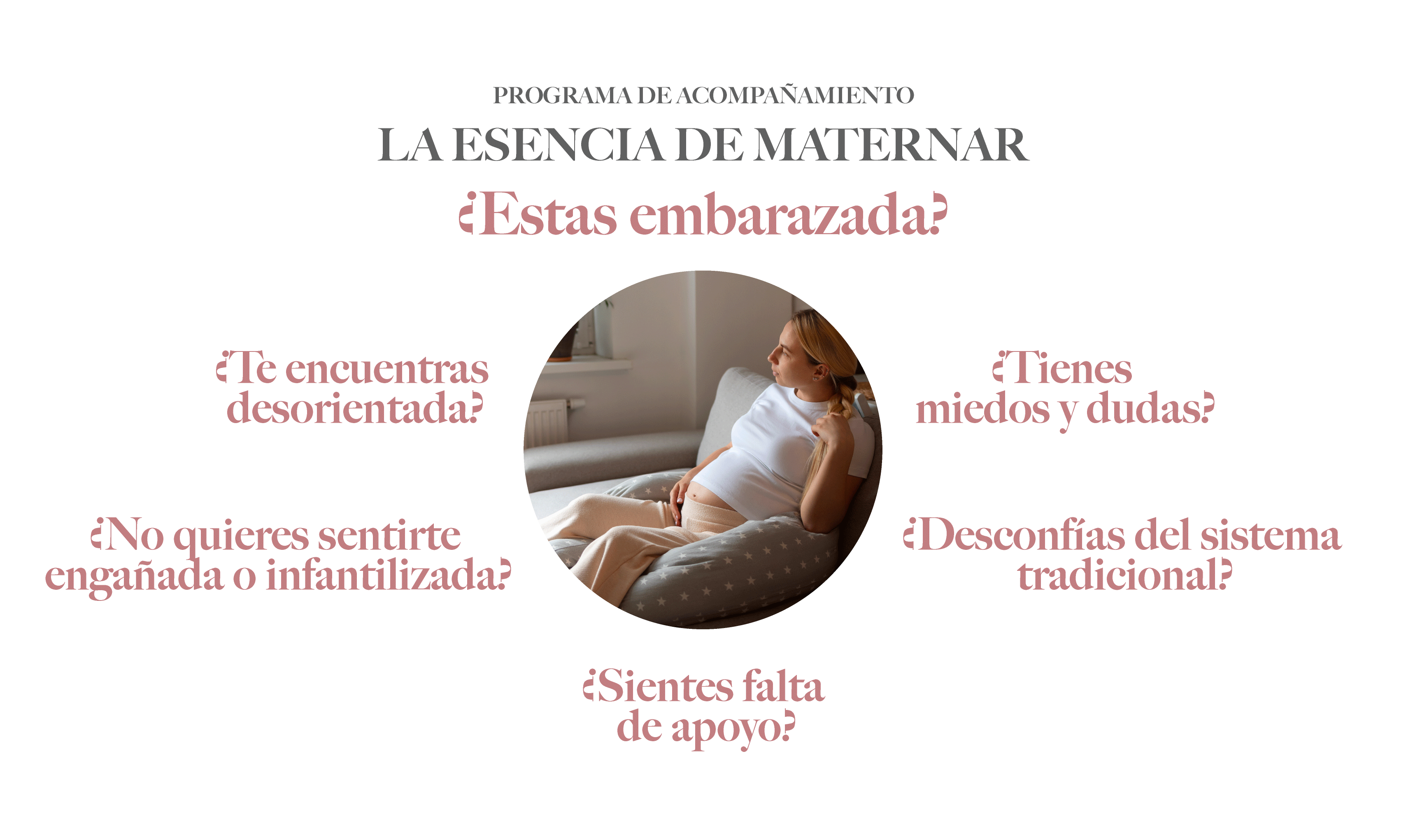 Programa totalmente personalizado para acompañar a mujeres embarazadas durante 8 sesiones exclusivas, para que descubran su propia esencia como madres y su forma única. Para que dejen de sentirse desconectadas, inseguras o temerosas a confiar y disfrutar plenamente de su gestación.